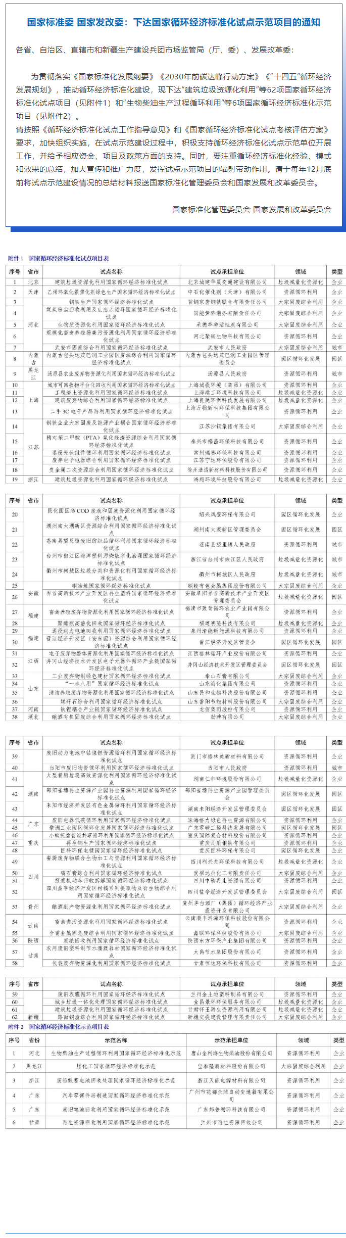国家标准委 国家发改委:下达国家循环经济标准化试点示范项目的通知